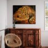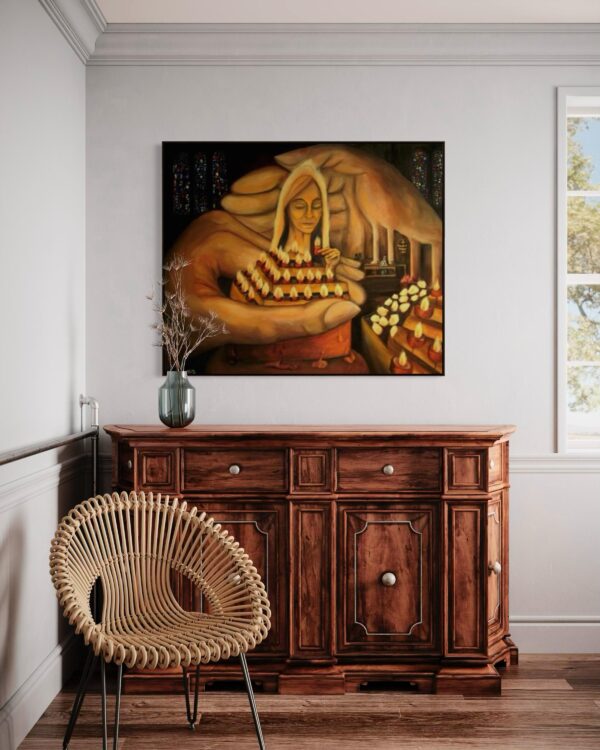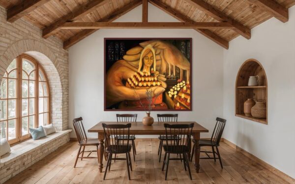 The original oil painting was created by Veru Narula in his studio and captured a fleeting moment. Each print is created at an Atelier in Los Angeles that actually is so pristine that it at times surpasses the amazing recessional effect of the original. Additionally, each print is unique because a textured gel applied by hand at the Atelier to the top waves to give a glistening effect. Ocean of Abundance Prints are superior products, and are wrap printed on the side and comes ready to hang with wire attached at the back. If you prefer a frame, that is available at check out and comes in White, Black and Oak Wood.