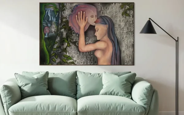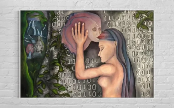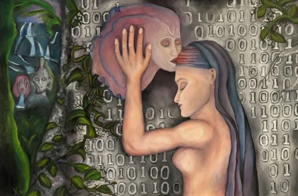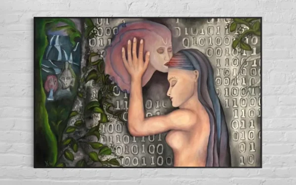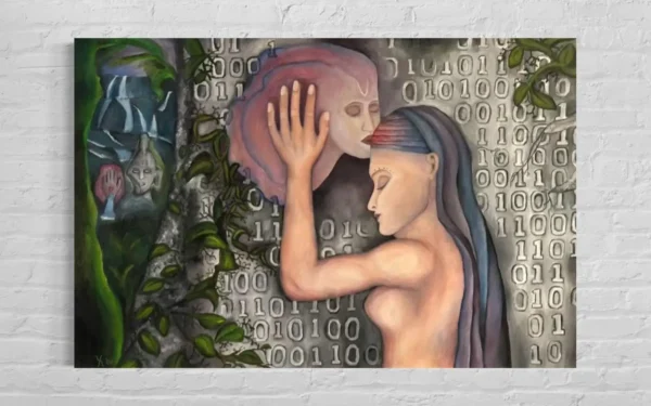 Look to the future, as the woman connects to an ancient wall, of today’s binary 0’s & 1’s