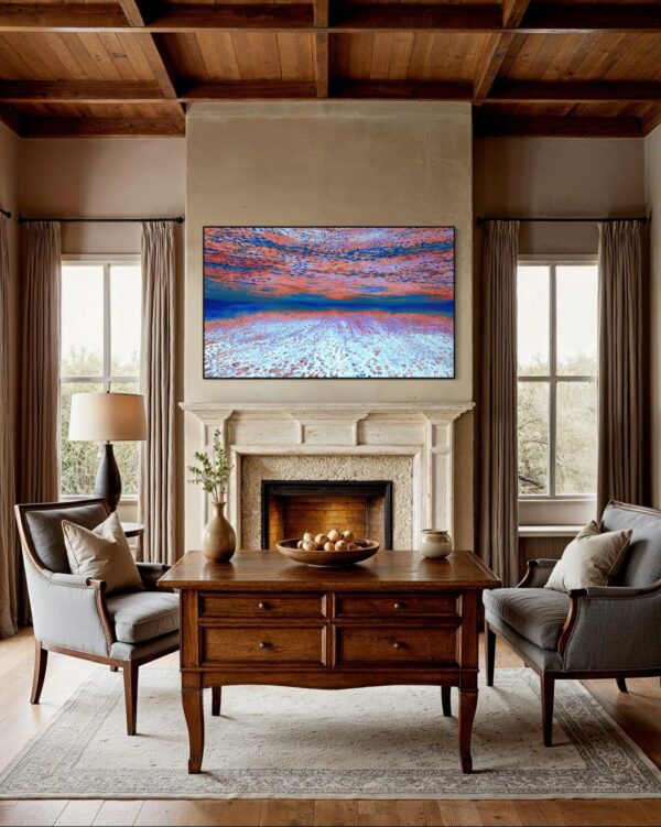 Watch through your smartphone camera as the 3D waves in the painting subtly,gently start to move. The artworks are programmed with Augmented Reality,in partnership with MyWebAR,® and use a simple QR code over which to hover. Delight friends and family!