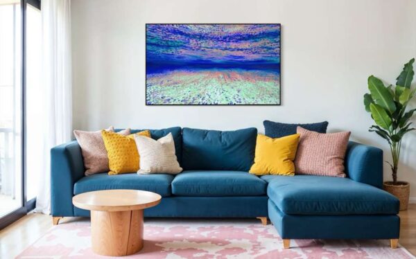 The original oil painting was created by Veru Narula in his studio and captured a fleeting moment. Each print is created at an Atelier in Los Angeles that actually is so pristine that it at times surpasses the amazing recessional effect of the original. Additionally, each print is unique because a textured gel applied by hand at the Atelier to the top waves to give a glistening effect. Ocean of Abundance Prints are superior products, and are wrap printed on the side and comes ready to hang with wire attached at the back. If you prefer a frame, that is available at check out and comes in White, Black and Oak Wood.