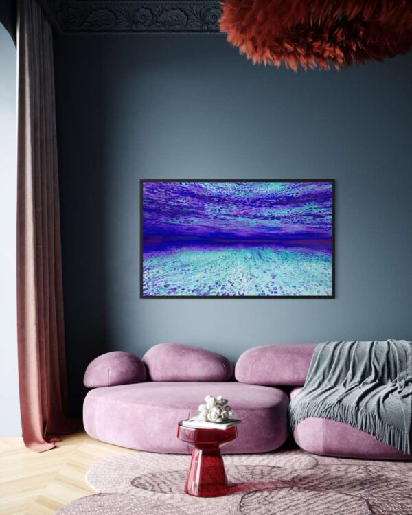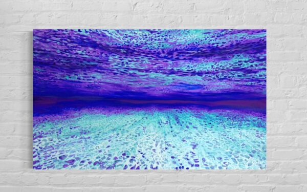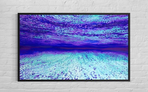 The original oil painting was created by Veru Narula in his studio and captured a fleeting moment. Each print is created at an Atelier in Los Angeles that actually is so pristine that it at times surpasses the amazing recessional effect of the original. Additionally, each print is unique because a textured gel applied by hand at the Atelier to the top waves to give a glistening effect. Ocean of Abundance Prints are superior products, and are wrap printed on the side and comes ready to hang with wire attached at the back. If you prefer a frame, that is available at check out and comes in White, Black and Oak Wood.