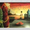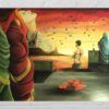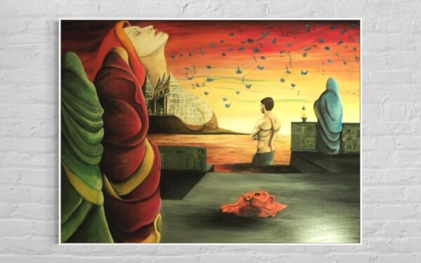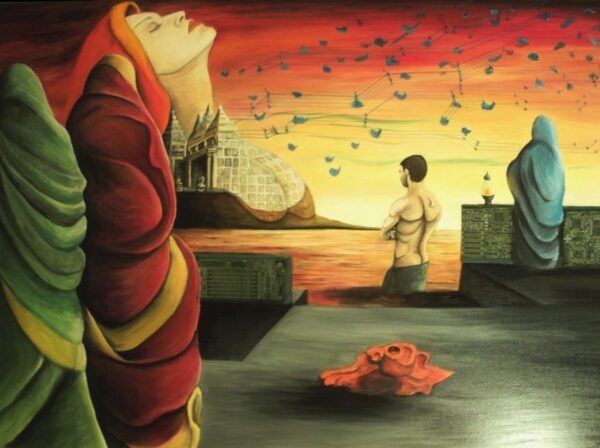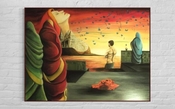 “Digital Muse” (Oil on Canvas, circuit board walls, Glass Bead work stitched in circuit pattern). Originally exhibited at Queens Musuem of Art @queensmuseum, guy represents the conscious man, the three women in saris represent the three aspects of mind’s subconscious: ID, Ego and SuperEgo, and finally the figure emerging from the temple represents the SuperConsciousness.