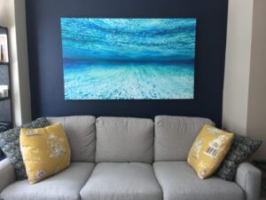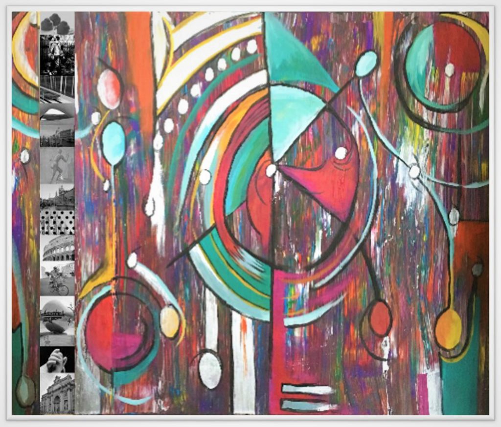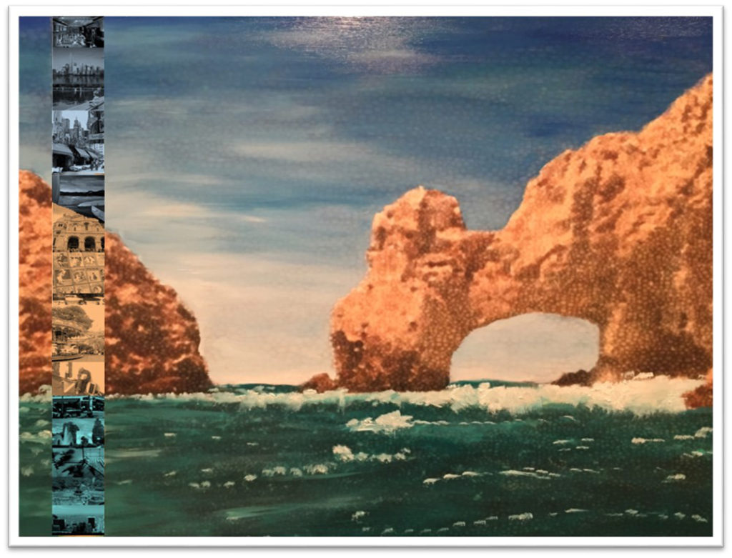 Inspired by a trip to Cabo San Lucas, Mexico. This piece captures the boundless energy of travel and discovery. The metallic strip represents captured memories, while warm, expansive strokes symbolize new horizons. It’s a visual gateway into a shared future — bold, hopeful, and luminous.